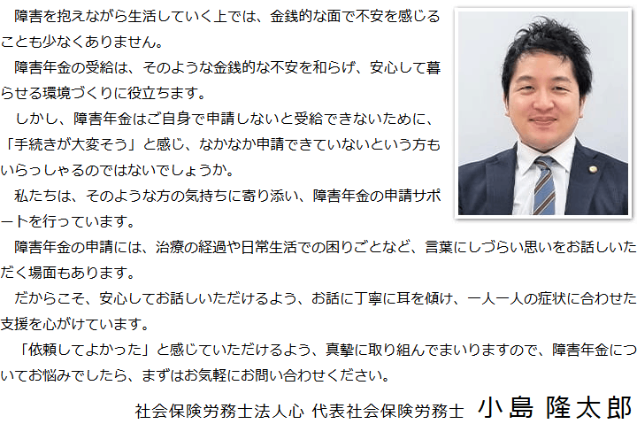 トップその他代表メッセージ 階層構造▼ その他(目次) 代表メッセージ その他(目次)その他トップ共通バナー※消さない障害年金無料診断サービス初めて障害年金を申請の方へ手続きの流れ代表メッセージ電話・テレビ電話相談について電話・テレビ電話相談の流れ心グループニュース(新着情報)お客様相談室費用の安さにこだわる理由関連リンクプライバシーポリシー 受付時間 平日 9時~21時、土日祝 9時~18時 夜間・土日祝の相談も対応します (要予約) 所在地 〒250-0011 神奈川県小田原市栄町1‐8-1Y&Yビルディング3F 0120-25-2403 お問合せ・アクセス・地図